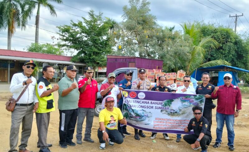 Rimbo Bujang, Jumat, 12 Desember 2025, di hari baik penghulu hari, gabungan Insan Media/ Pers dalam Komunitas Wartawan Tebo (KAWAT) bersama Ormas RAMPAS 08 dan LSM LCKI (Lembaga Cegah Kejahatan Indonesia) sumbangkan hasil donasi bencana Sumbar.