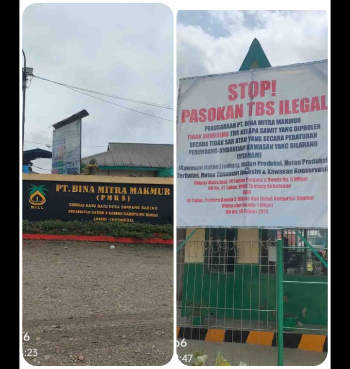 BUNGO,JAMBI – Praktik dugaan mafia hasil perkebunan kembali mencuat di Kabupaten Bungo. PT Bina Mitra Makmur (BMM) yang beroperasi di Desa Simpang Babeko, Kecamatan Bathin II Babeko, kini menjadi sorotan tajam setelah diduga kuat menerima pasokan Tandan Buah Segar (TBS) kelapa sawit yang bersumber dari kawasan terlarang.
