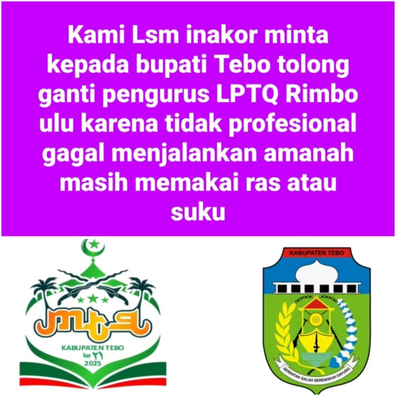 Dengan nada geram, Bd meminta agar Bupati Tebo Agus Rubiyanto mengganti Pengurus LPTQ Rimbo Ulu di copot karena dianggap gagal menjalankan amanah masih memakai ras dan suku.